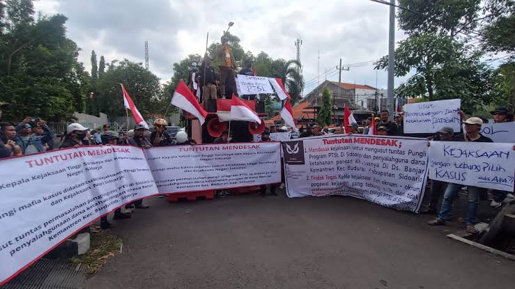 Dalam aksinya, mereka menuntut kasus dugaan pungutan liar (pungli) program Pendaftaran Tanah Sistematis Lengkap (PTSL) dan penyalahgunaan dana ketahanan pangan yang telah mereka laporkan sejak 13 April 2024.